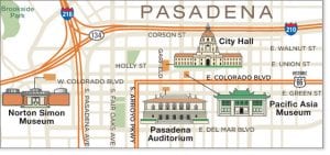 Between Glendale and Arcadia sits Pasadena, known for hosting the annual Rose Bowl football game and Tournament of Roses Parade. In addition, Pasadena is also home to many scientific and cultural institutions, including the California Institute of Technology (Caltech), the Pasadena Playhouse, the Norton Simon Museum of Art and the Pacific Asia Museum. Old Town Pasadena spans 21 blocks downtown and boasts upscale retail shops and a wide variety of restaurants, nightclubs, outdoor cafés, pubs, and comedy clubs and features renovated historic architecture. There is an upscale open-air shopping mall designed to be a modern urban village. Pasadena also has the Rose Bowl Flea Market, a large swap meet that involves thousands of dealers and tens of thousands of visitors in and around the grounds of the Rose Bowl which has been held every second Sunday of the month, rain or shine, since 1967.[105]